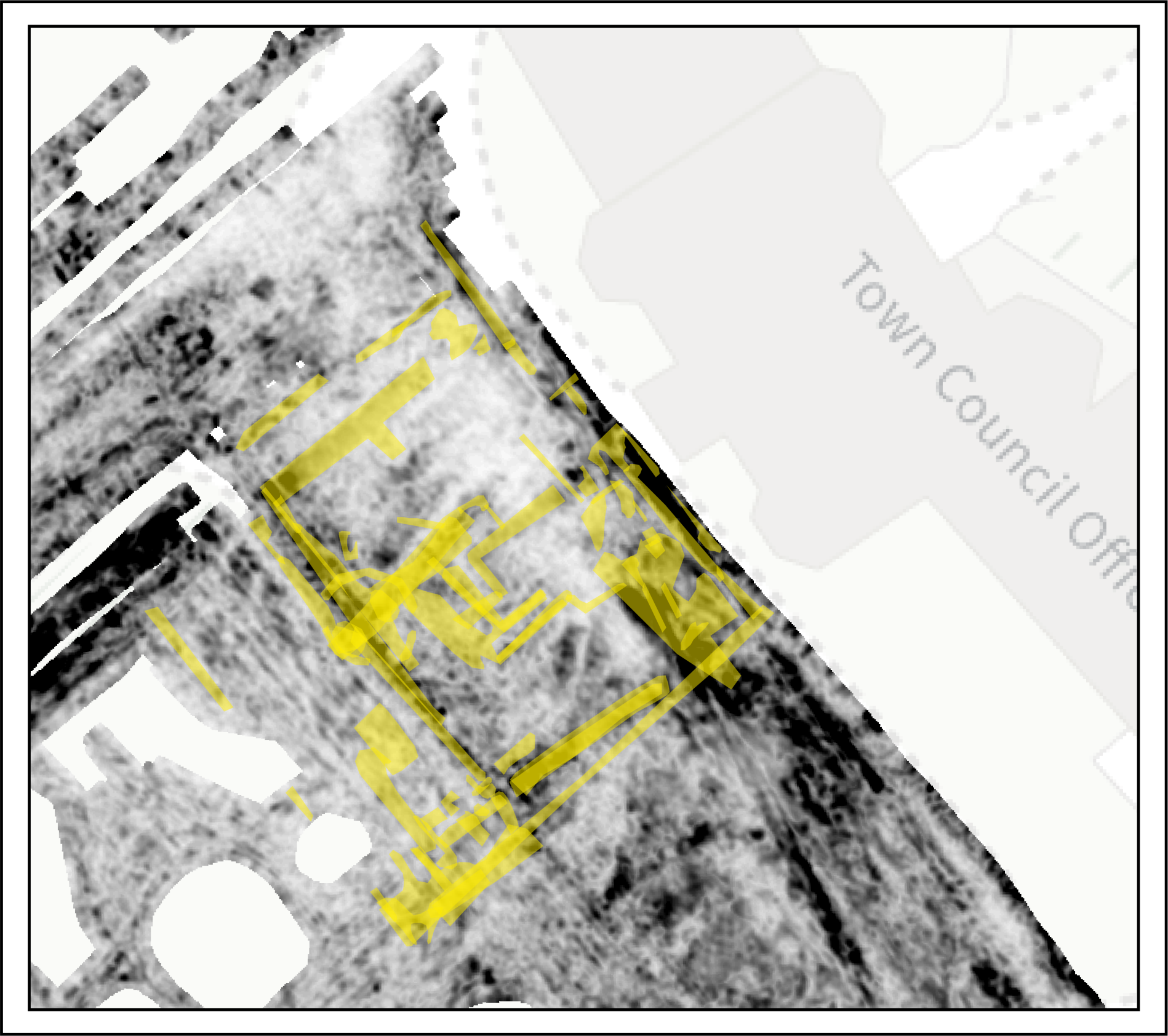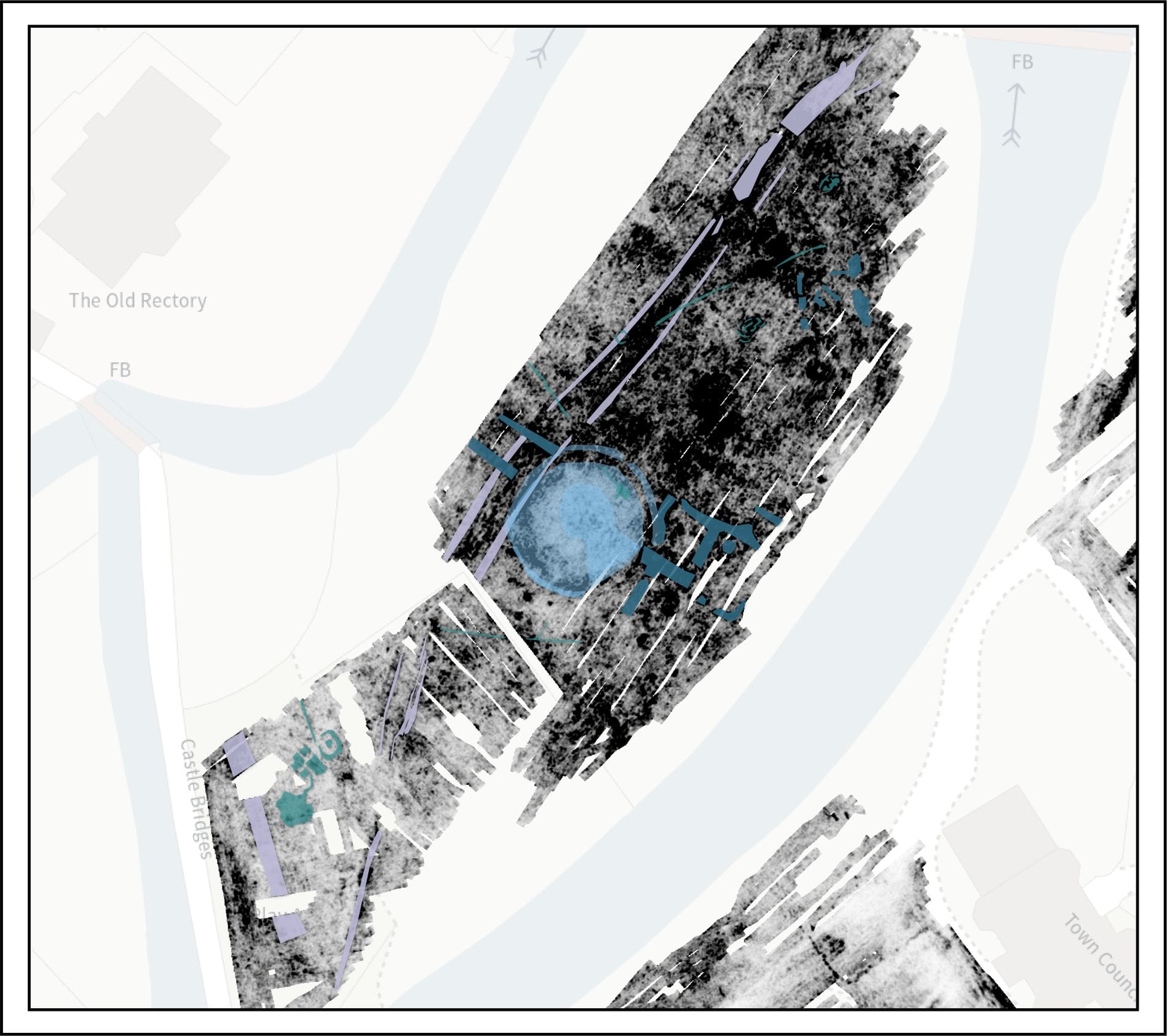 On "the Island" area, the survey identified a prominent sub-circular anomaly approximately 15 metres in diameter, interpreted as a probable well chamber covered by a mound. The feature exhibits characteristics consistent with a subterranean chamber from which water could be pumped, probably via a pipe identified on the eastern side of the structure. A trackway was also detected running along the spine of the Island at depths between 0.7 and 1.5 metres.