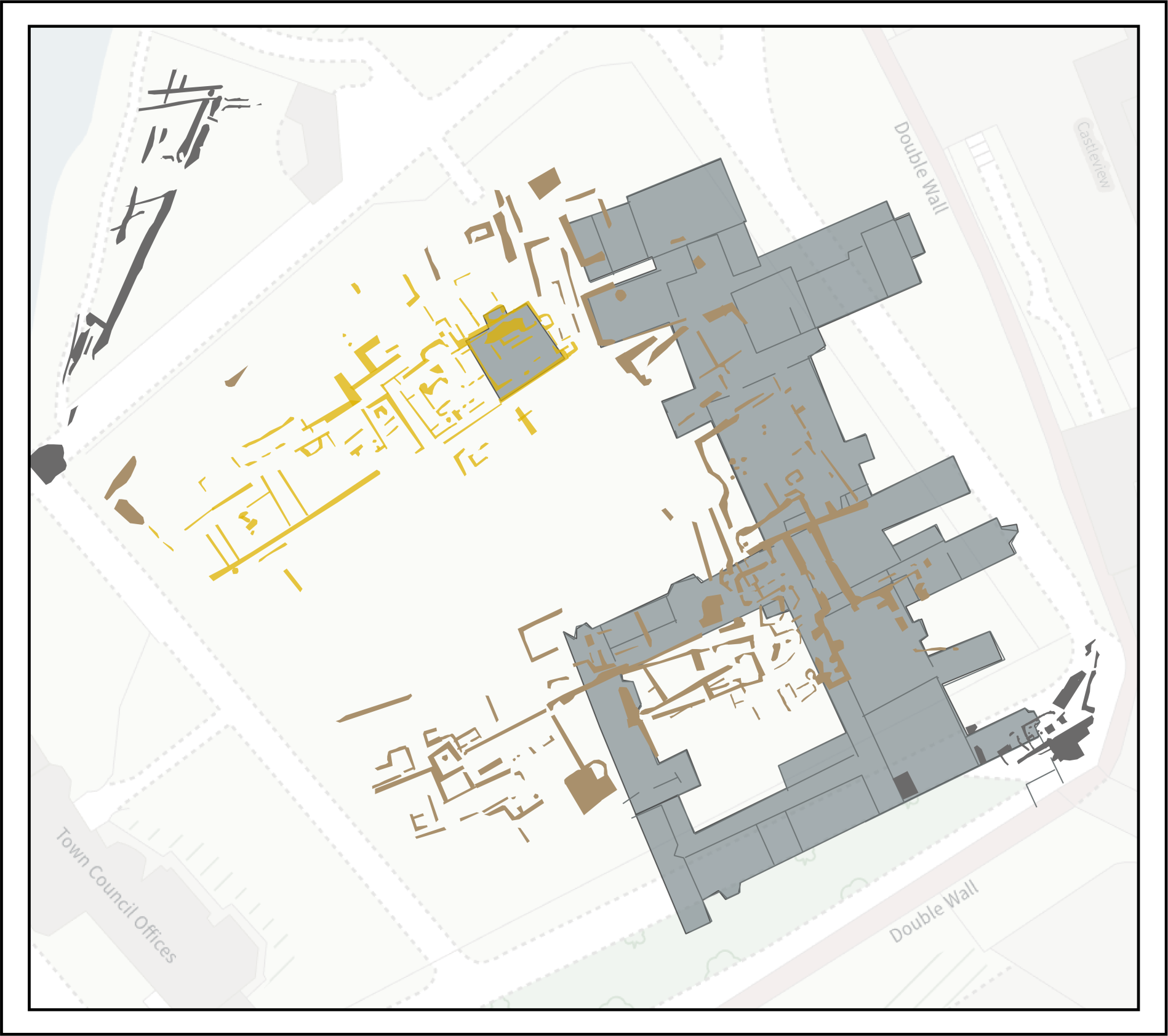 [Image: Combined GPR interpretation showing the three ranges of Tudor buildings]