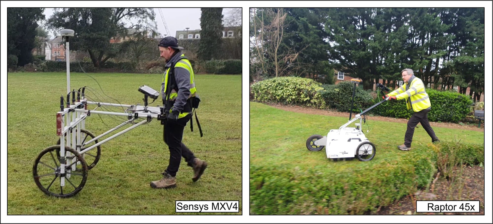 [Image: Survey equipment - showing both the magnetic cart and GPR system in operation]