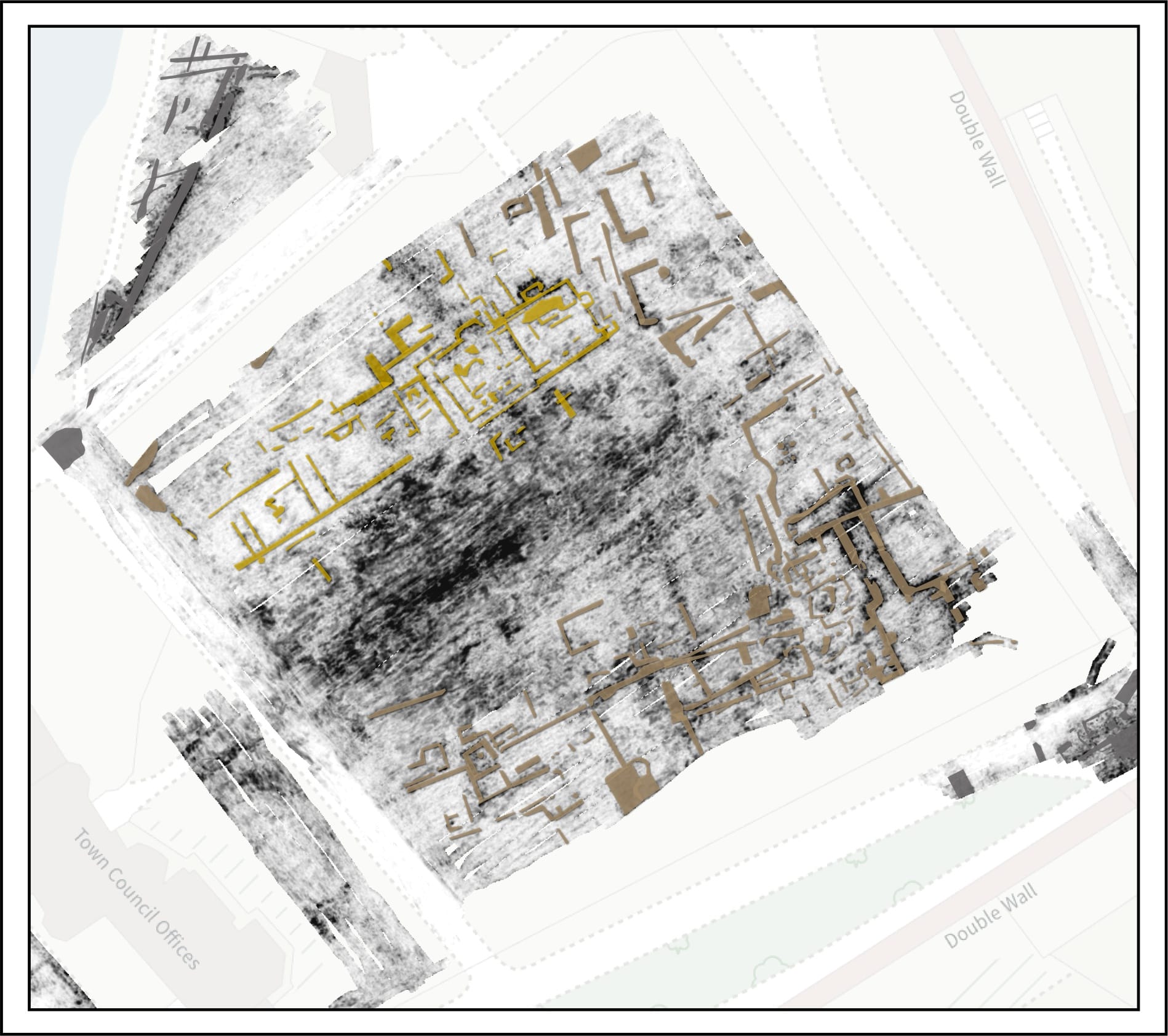[Image: Comparison showing Hawthorne's plan overlaid with the correct orientations revealed by geophysics]